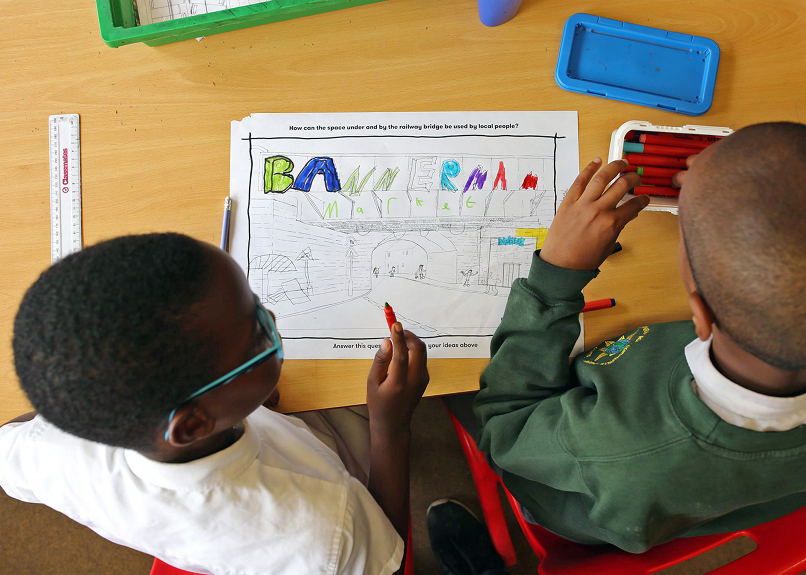 Bahbak worked with Year Five children to creatively reimagine the area, which was then a busy junction where two roads met under a railway bridge. They drew, painted, walked, and sculpted; all the time talking and thinking about how it felt to be in the space.