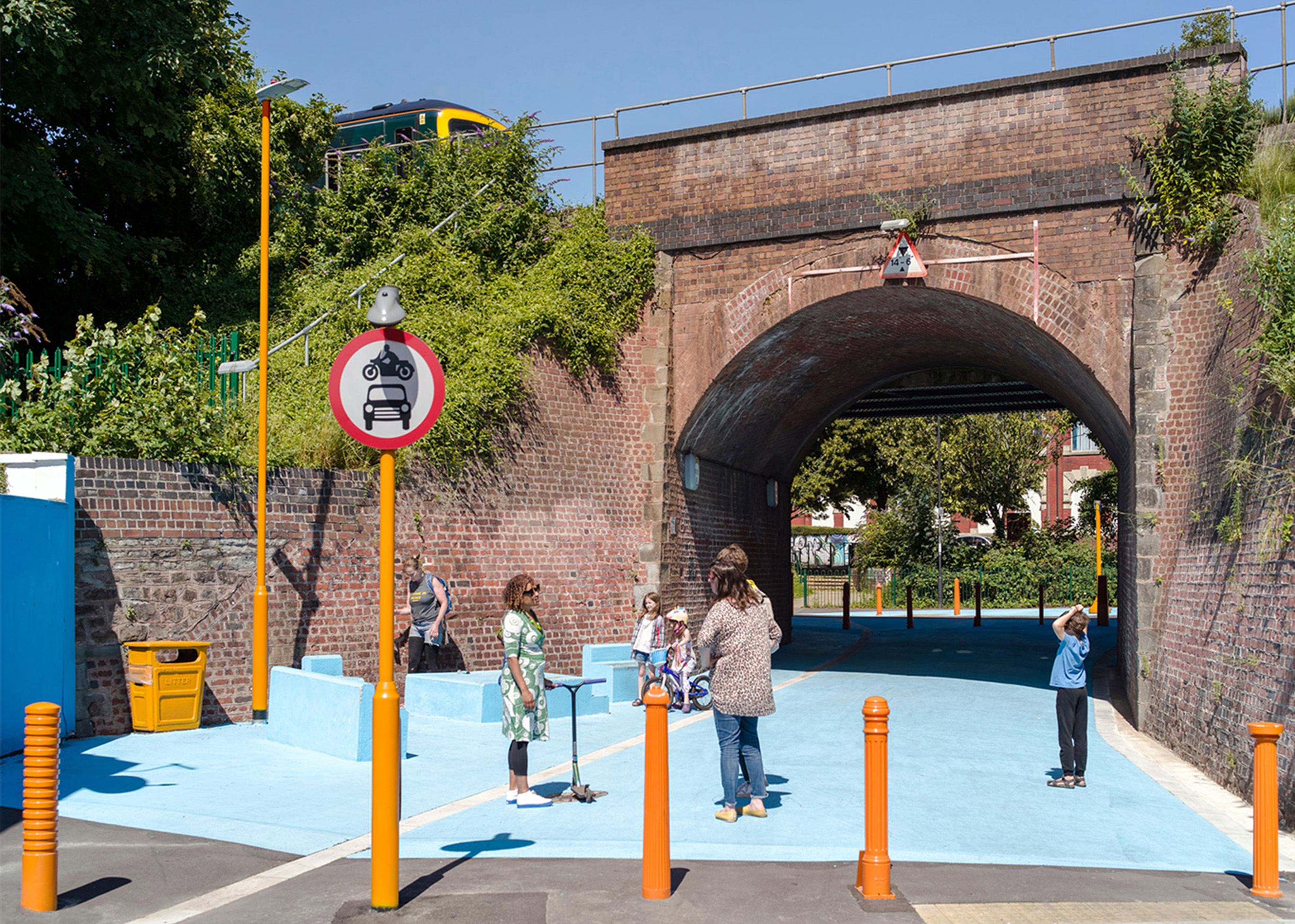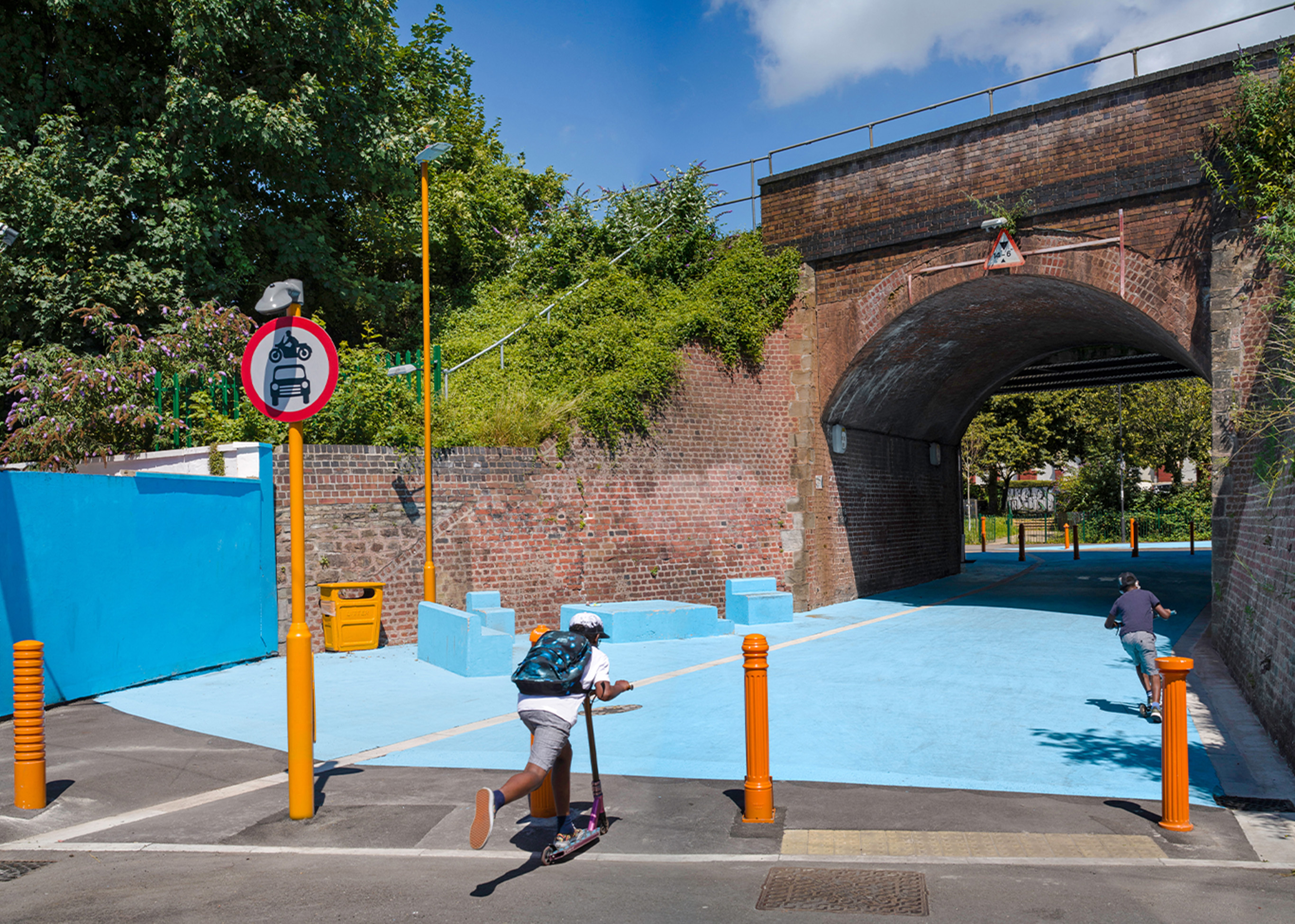 The Easton Safer Streets proposal included a raised table to slow traffic, and improved lighting and signage. Our design introduced a museum of bollards – a playful collection of different bollards all painted the same colour that skirts the area, and a large coloured surface to indicate a safe space where the experiences of children are prioritised.